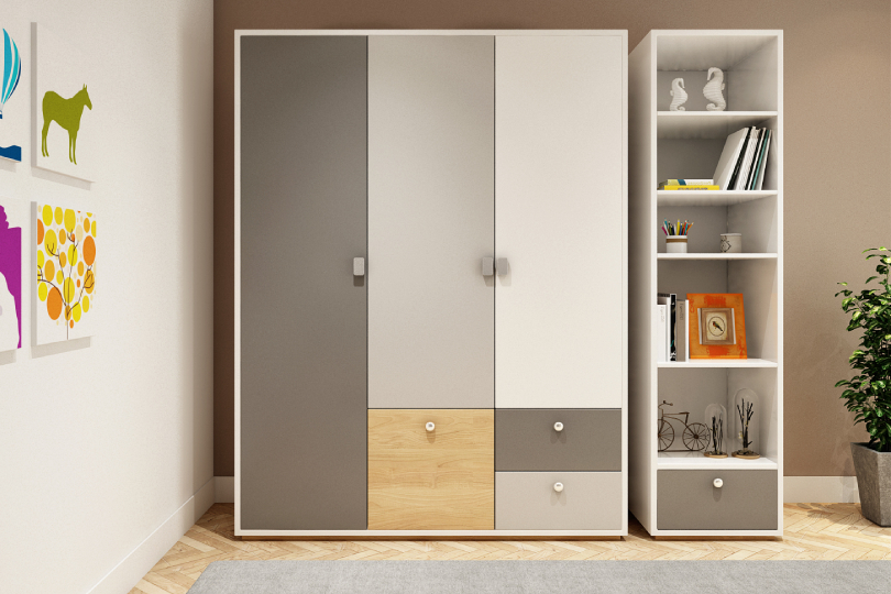 A design fit for teenagers this hinged wardrobe showcases a playful color combination without being too loud. Crafted with premium laminate and along with an ancillary shelf space to provides additional storage, this wardrobe adds elegance to the room.