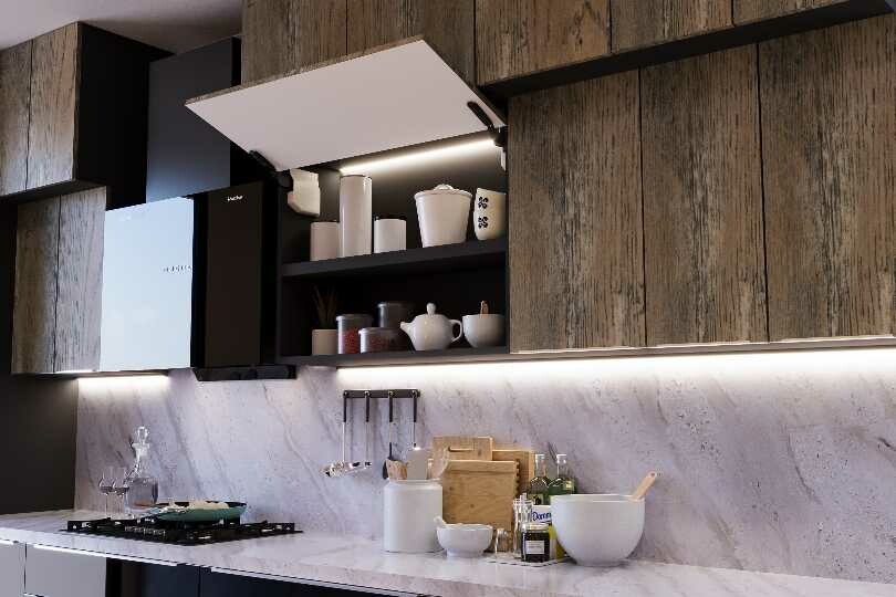 In the kitchen, a white Caesar stone island contrasts with sleek wood tone upper cabinets and and lacquered glass brown base shutters. The pendant light on the extended breakfast table adds to the style whereas the sleek glass finish tall unit adds the right amount of glamour equipped with latest appliances.