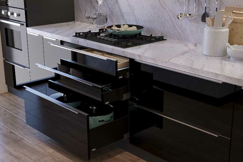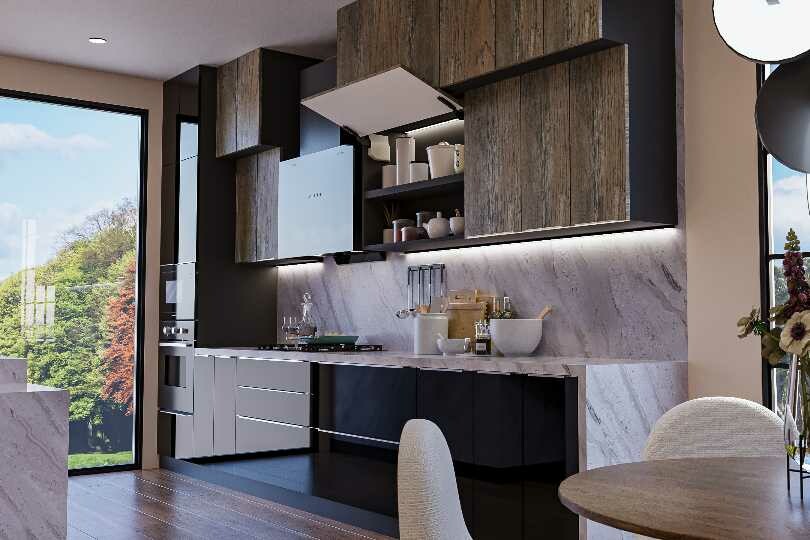 Island kitchen with rustic look stone finish