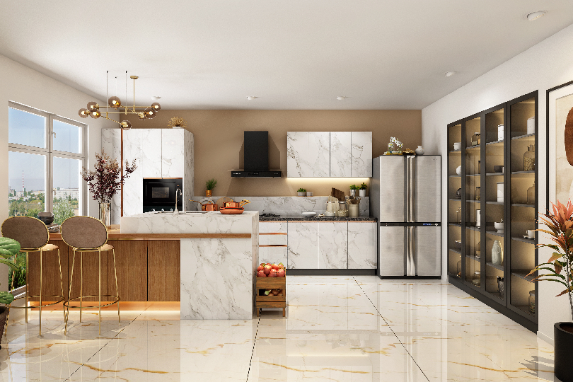 The fluid lines of Fusilux evokespure emotion.A design that is soft anddistinctive to the most importantpart of your home, rendering itmore functional and ergonomic.The marble finish acrylic shutteralong with a full wall AluminumFramed storage cupboard withglass shutters further adds to itsprestigious appeal turning thekitchen timeless.