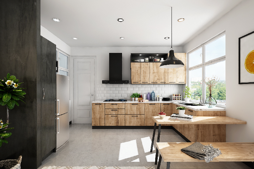 L-shaped kitchen with cypresswood finish