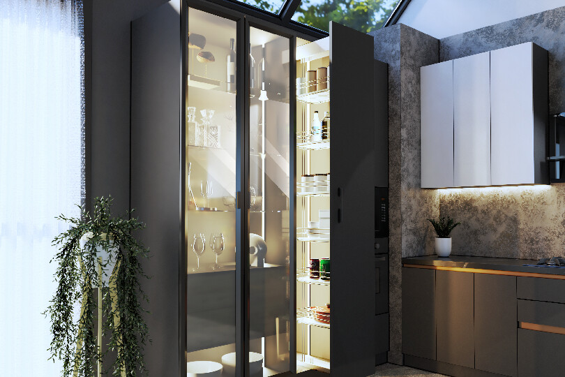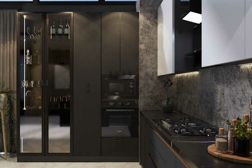 This attic kitchen uses the slant light from the angular window to create a warm space. However, even if you do not have an attic this style could be recreated in any kitchen where one wall is longer than the other. Using all neutral colors, the space has every element starting from crockery unit to pantry and island that doubles up as a breakfast bar.