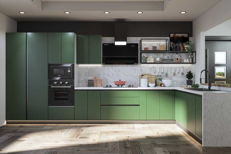 L-shaped kitchen with sage green cabinets