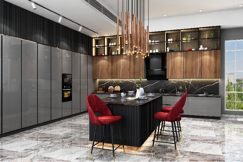 L-shaped kitchen with tall units and island breakfast counter