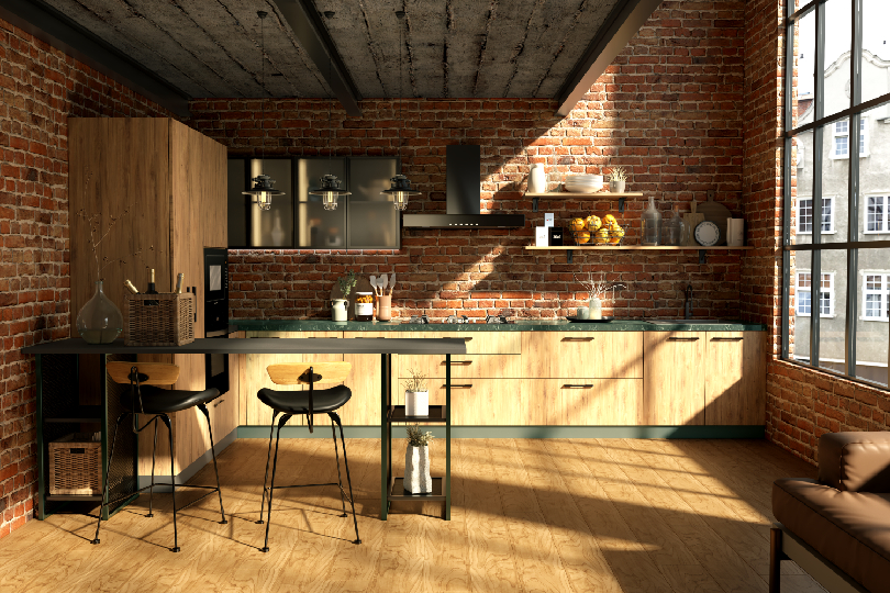 Modern kitchen with raw brick and Oakwood finish