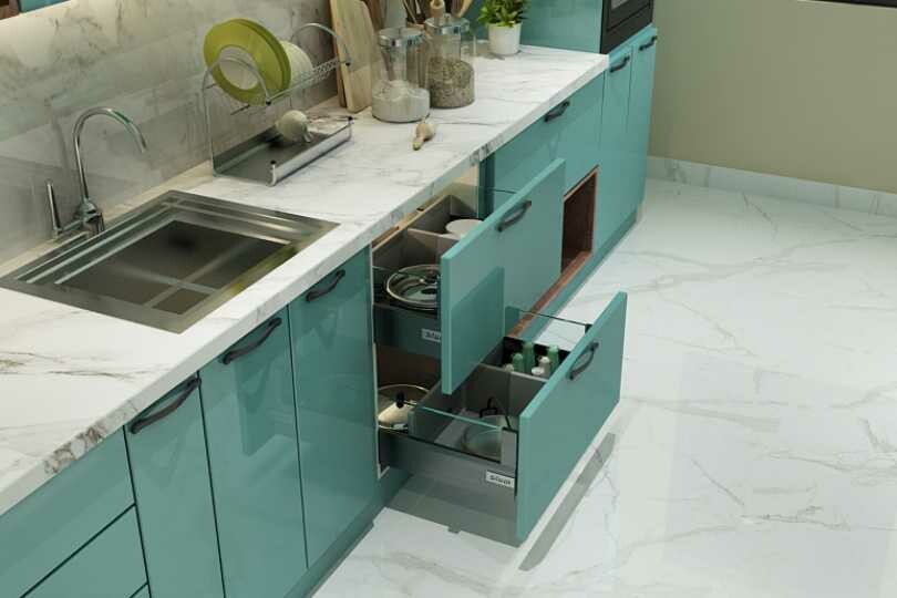 Parallel kitchen with gloosy teal and open woody cabinets