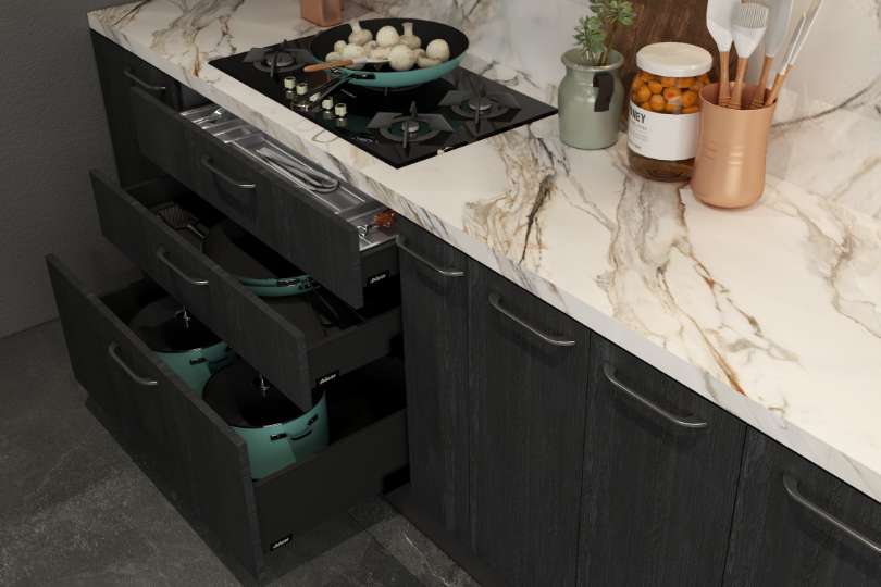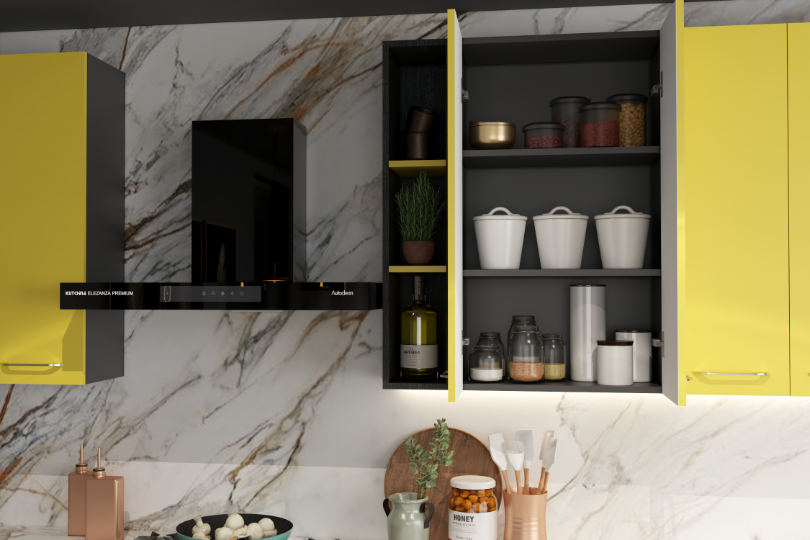 A yellow kitchen seldom fails to pop up the space while the black tones it down to create a classy look. This straight kitchen gives an option to play with marble dado to give it an arty touch.