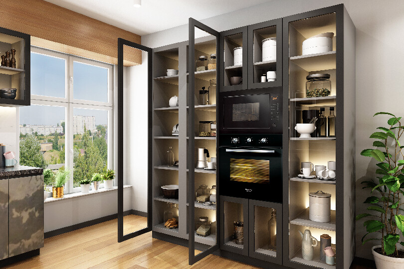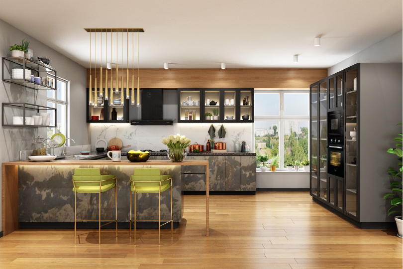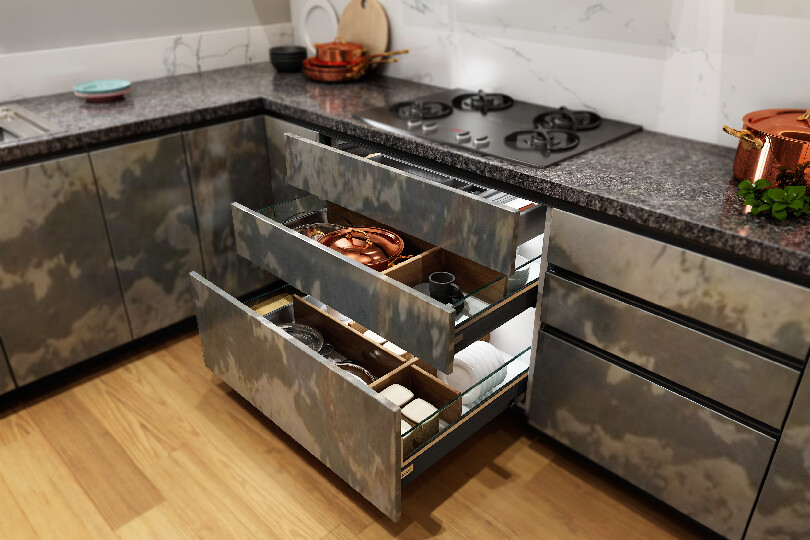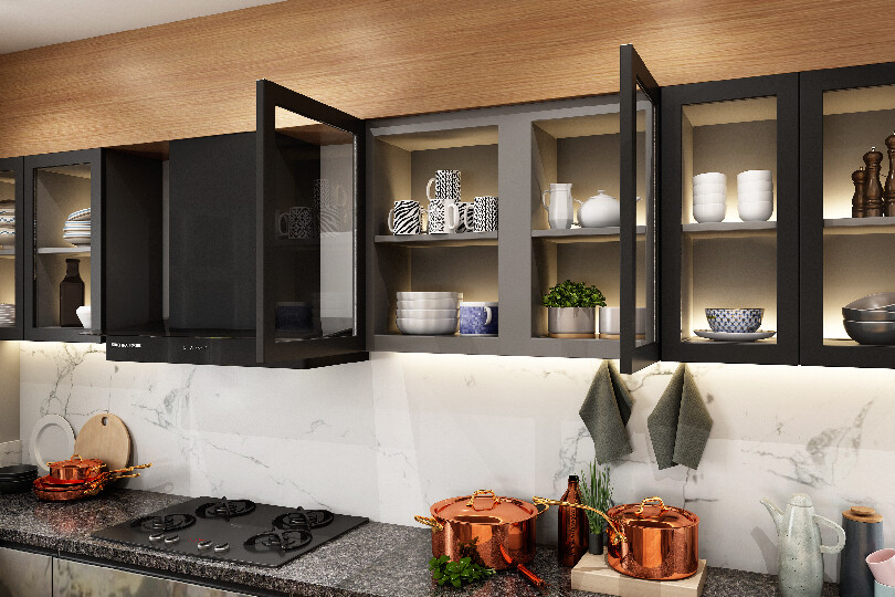 Stonilux, the latest trending kitchen with three dimensional stone finish shutters will give you a feel of being amidst nature while enjoying the sophistication of a state-of-the-art modern kitchen. The harmonious appeal of black appliances and glass shutters matches seamlessly with the textured feel of the stone veneer.