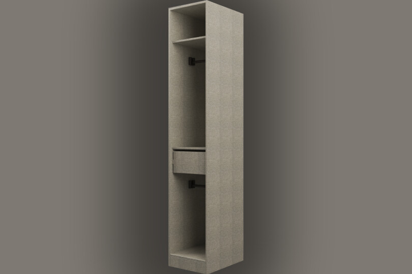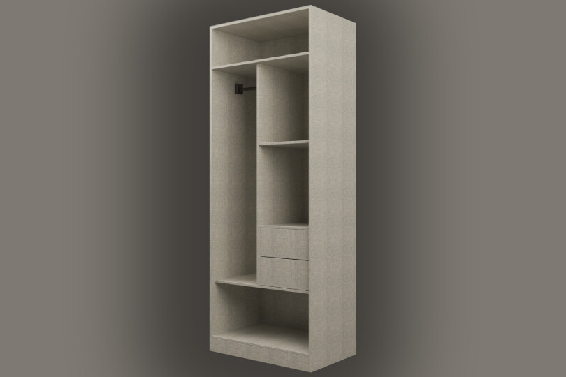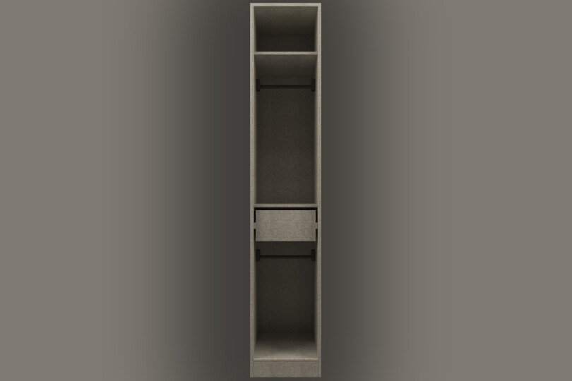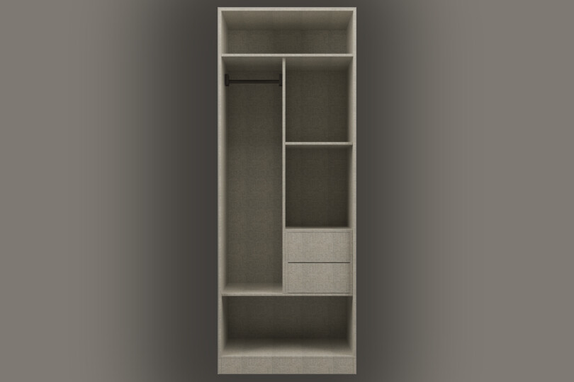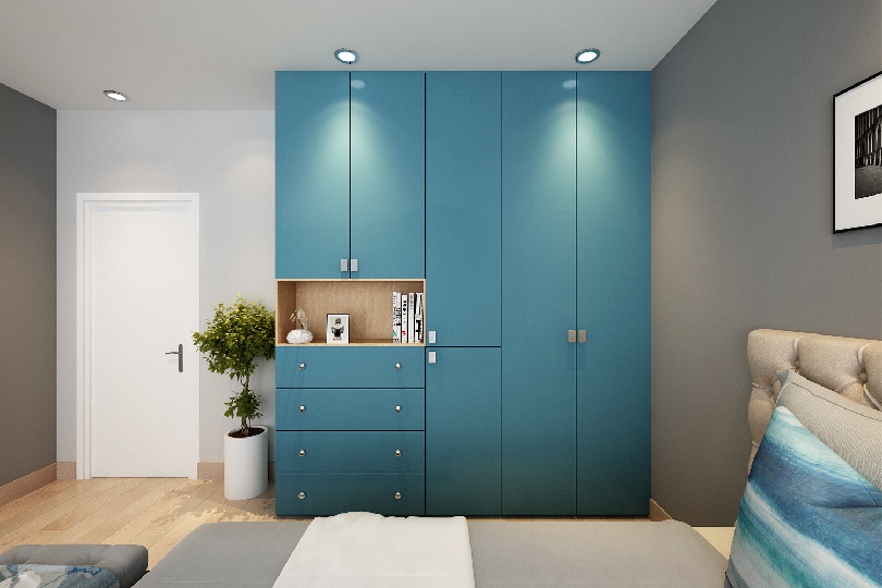 This gorgeous blue-hinged wardrobe design features a small wooden shelf space with drawers beneath it. The striking blue palette instantly catches the eye, adding a vibrant and refreshing element to any room. With its unique combination of color and storage options, this wardrobe is more than just visually pleasing—it becomes a statement piece.